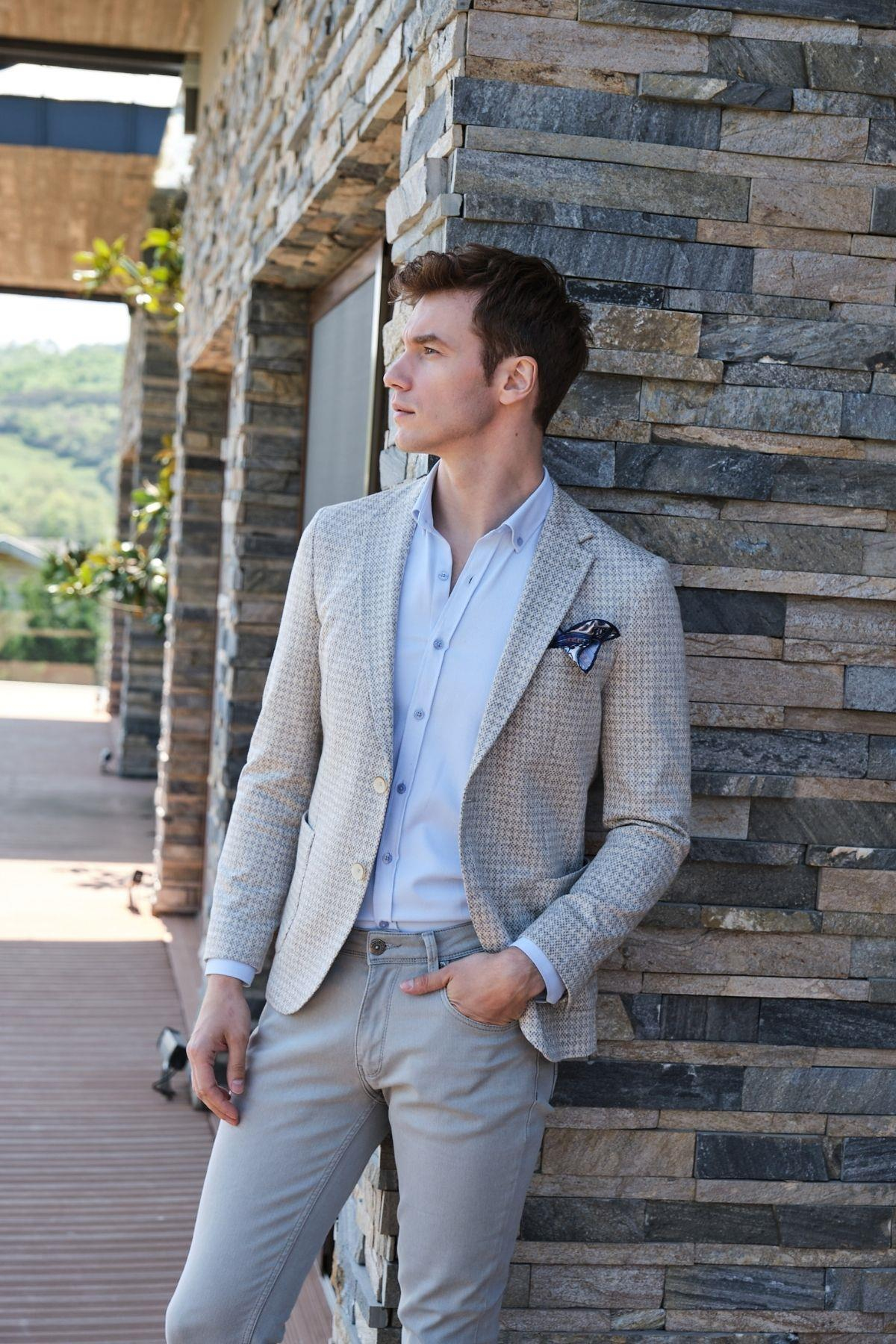 Morven Erkek Bej Pamuk Desenli Örme Slim Fit Ceket