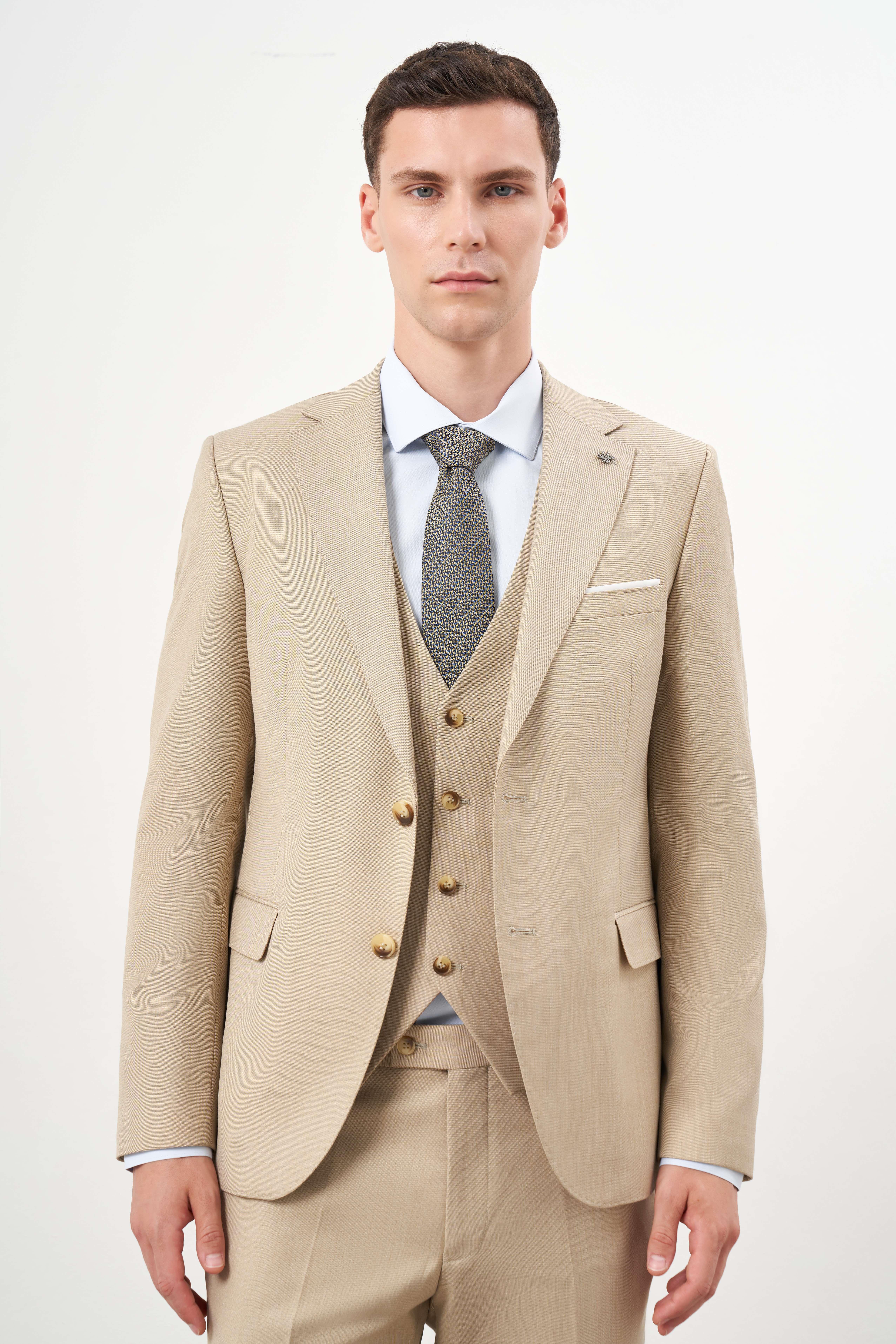 Morven Erkek Bej Poliviskon Basic Yelekli Düz Desen Slim Fit Mono Yaka Takım Elbise (24MC001133653)