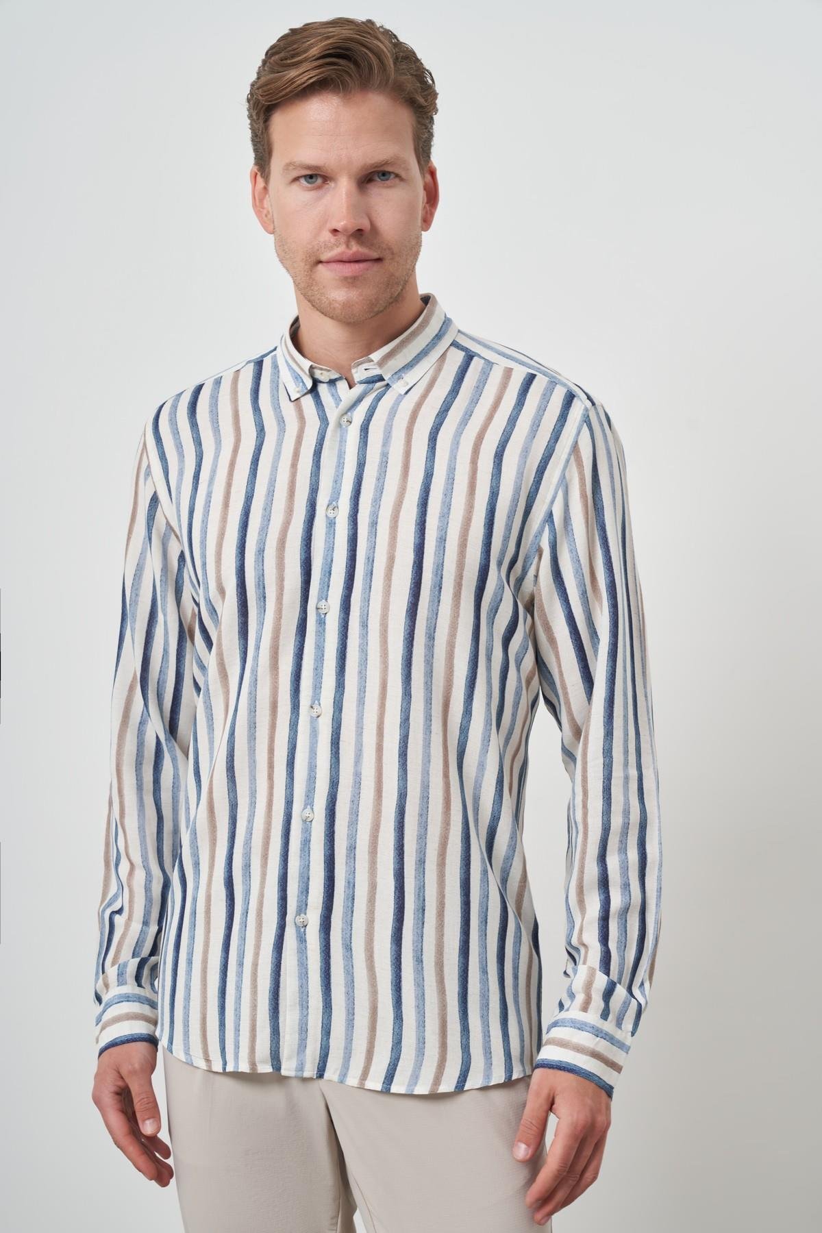 Morven Erkek İndigo Keten Çizgili Desen Düğmeli Yaka Slim Fit Gömlek