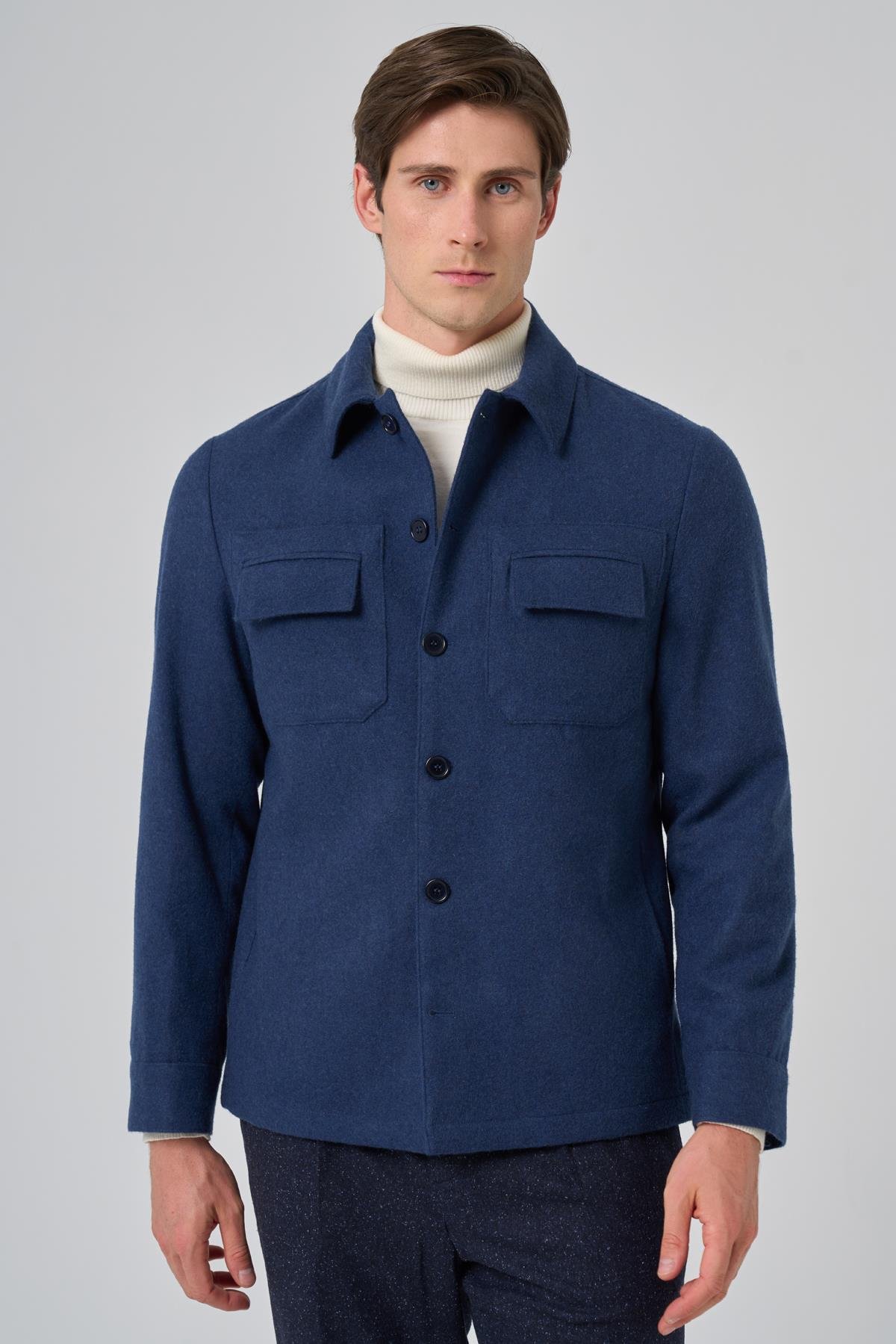 Morven Erkek İndigo Yünlü Berberi Yaka Çift Kapak Cepli Gömlek Ceket
