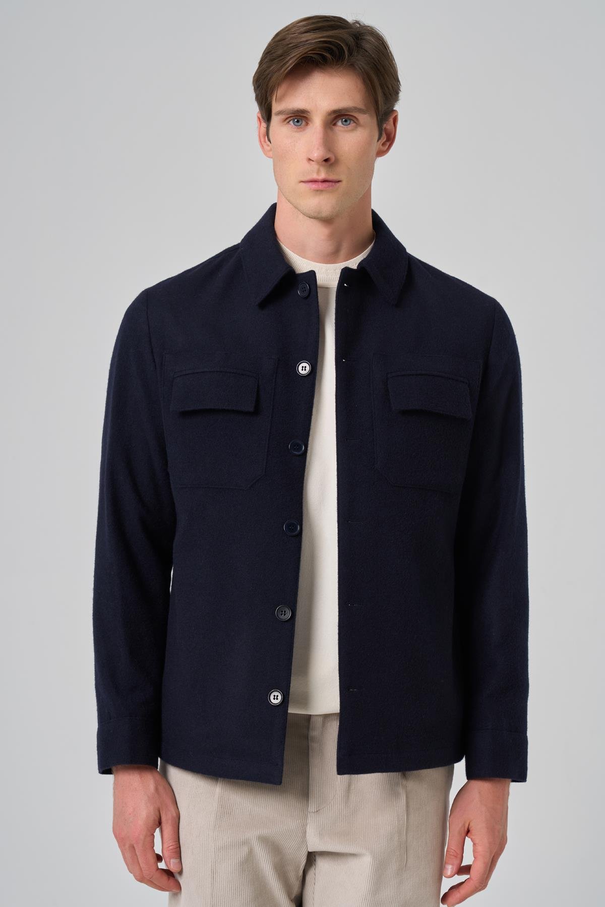 Morven Erkek Lacivert Yünlü Berberi Yaka Çift Kapak Cepli Gömlek Ceket