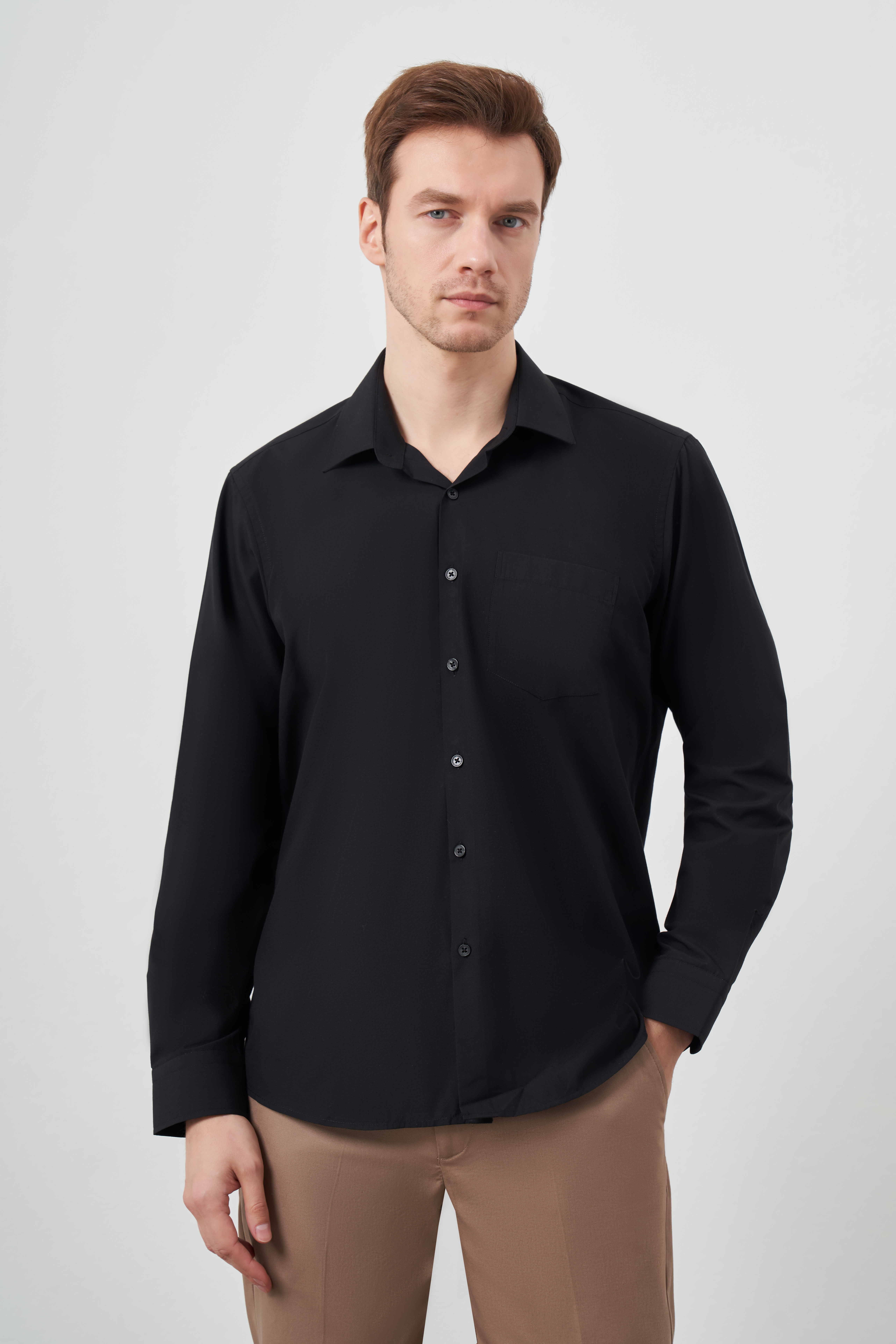 Morven Erkek Siyah Basic Düz Desen Cepli Sert Yaka Regular Fit Gömlek (24MC004077001)
