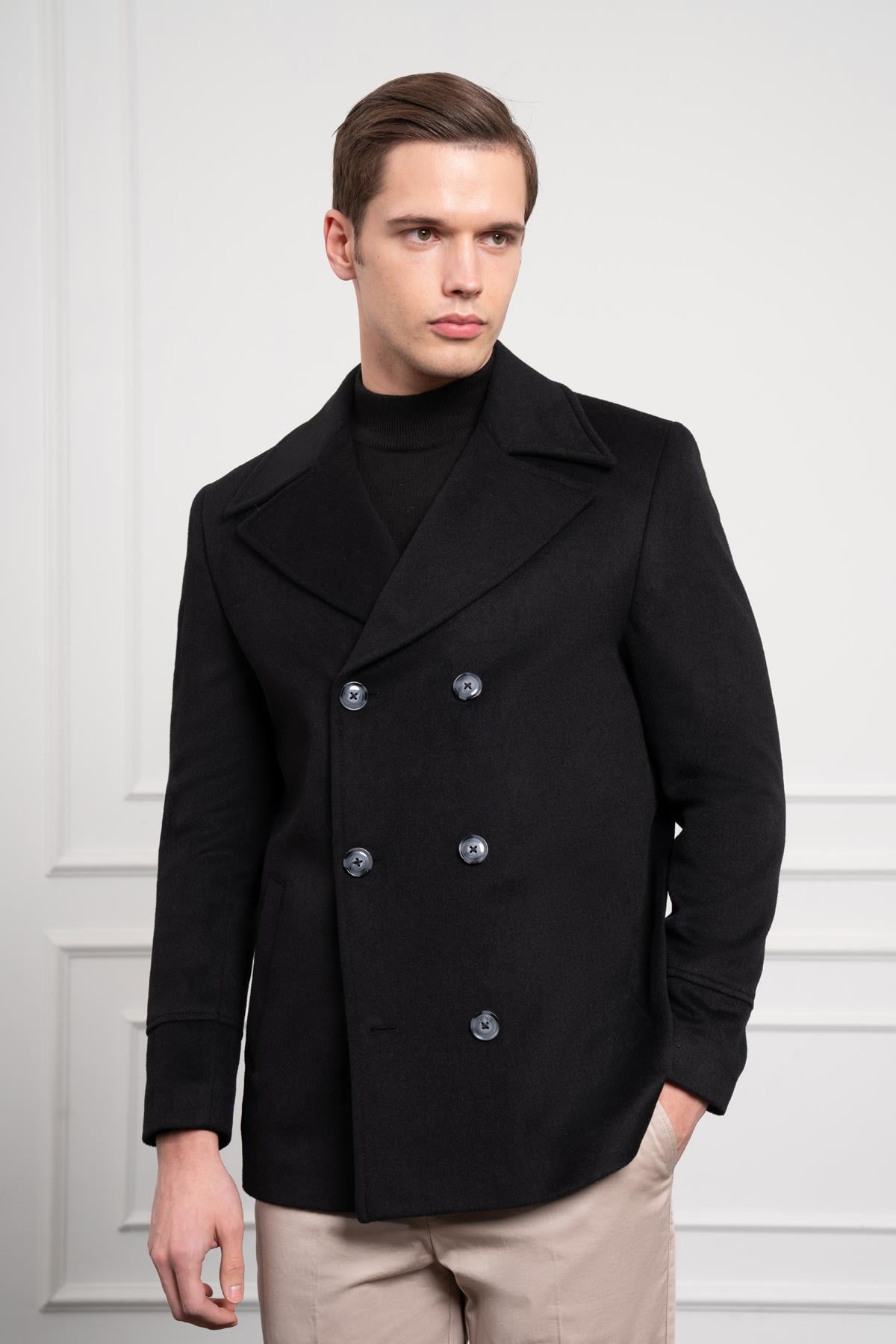 Morven Erkek Siyah Yünlü Kruvaze Dynamic Fit Sivri Yaka Kaban (25KS016014001)
